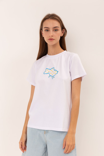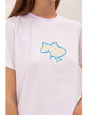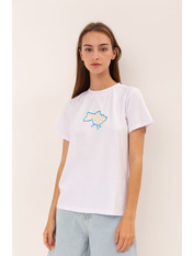 Класична біла футболка із патріотичним принтом. За рахунок вільного крою вона ідеально сідає на будь-яку фігуру, вміло приховуючи недоліки.