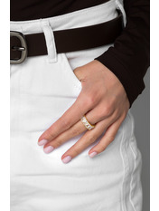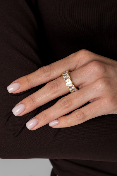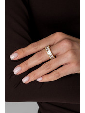 - Каблучка має класичну форму з золотистими елементами, що надає їй універсального вигляду та підходить під різні наряди.