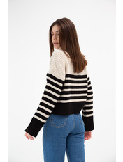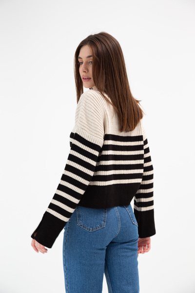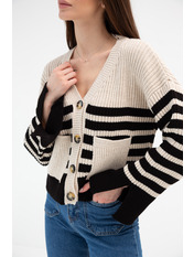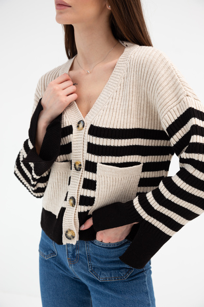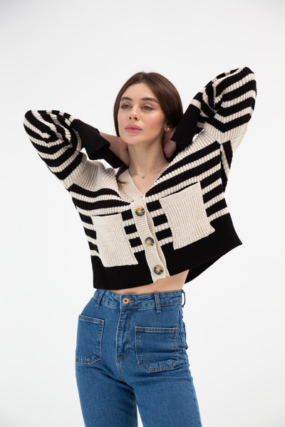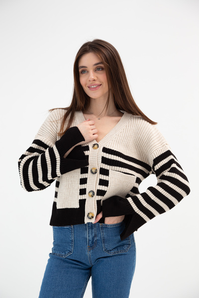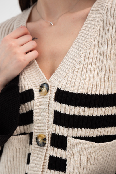 Кардиган доступний в універсальному розмірі one size, який підходить володаркам багатьох параметрів.Кардиган прямого укороченого крою має дві кишені спереду. Застібається він на ґудзики. Дизайн цієї моделі кардигана – горизонтальна смужка у бежево-чорному варіанті.