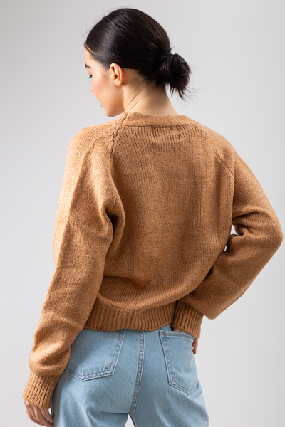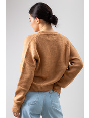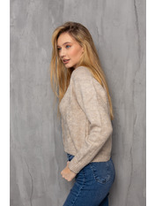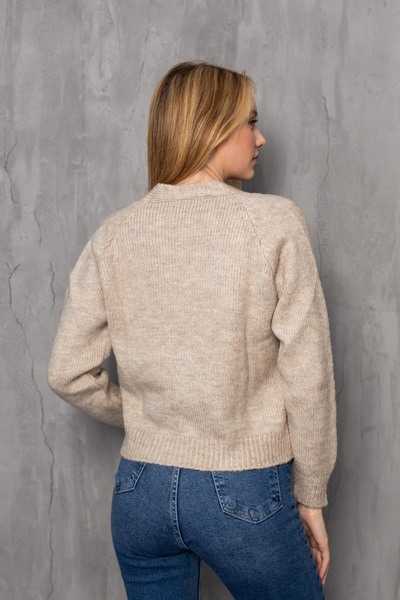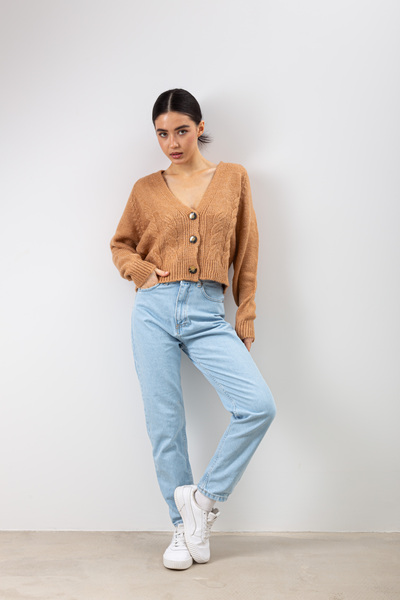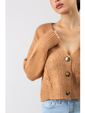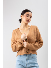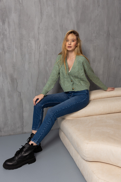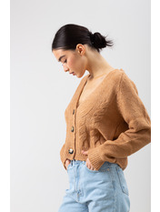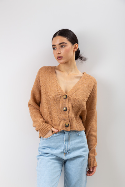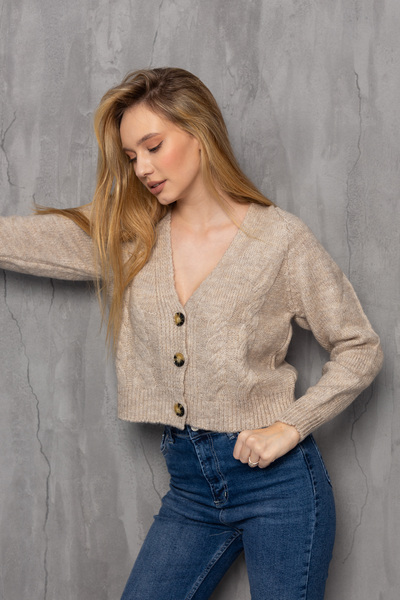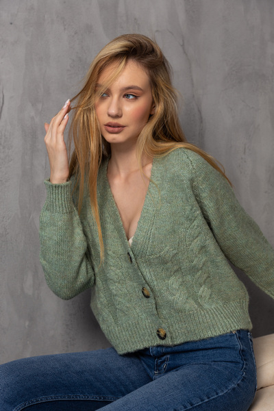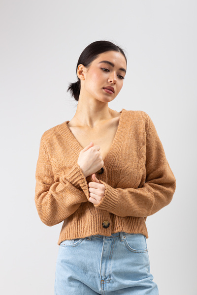 Укорочений кардиган є одним із головних трендів сьогодення. Матеріал, з якого він зв'язаний, дуже якісний, а ще він м'який та теплий. Дизайн у кардигана простий: однотонний, з невеликим в'язаним орнаментом спереду.Як доглядати та носити