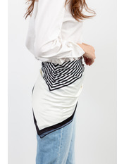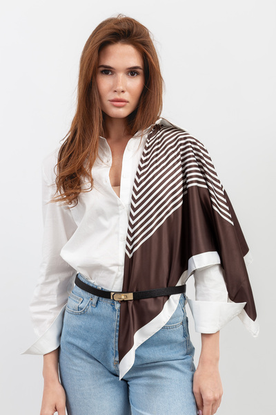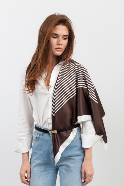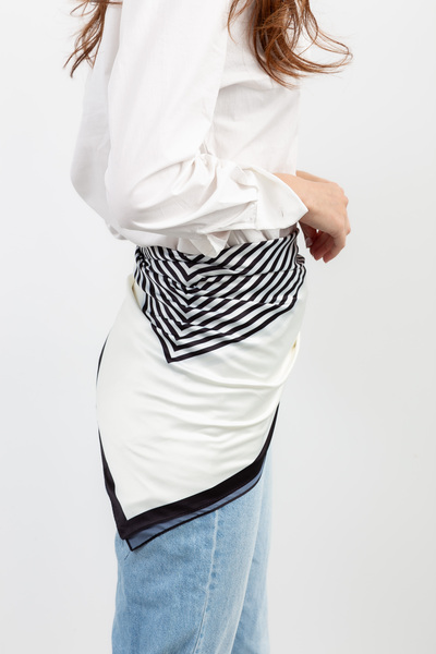 - Як аксесуар: Хустку можна зав'язати на шиї, голові, зап'ясті або на ручці сумки, додавши родзинку будь-якому образу. Вона чудово поєднується з блузами, сукнями, пальто та жакетами, створюючи ніжний акцент.