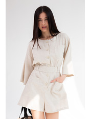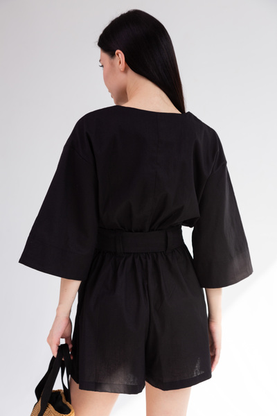 Ця модель має класичний крій, вільні рукави та зручний низ, який представлений шортами. Застібається комбінезон за допомогою ґудзиків спереду. Також він має чотири кишені: дві нагрудні та дві на шортах. До комібнезону також додається широкий пояс, який гарно підкреслить вашу талію.
