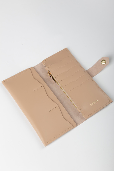 • БежевийГаманець виготовлений в Україні з якісної шкіри. Цей матеріал має розкішний вигляд, а також він міцний та стійкий до зношування.