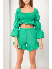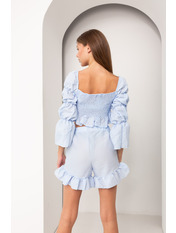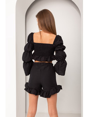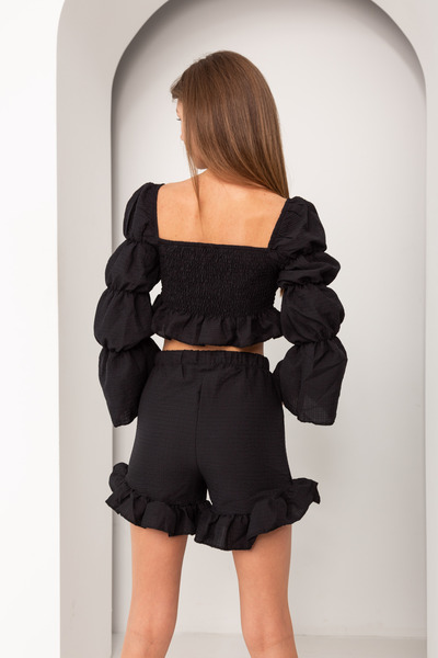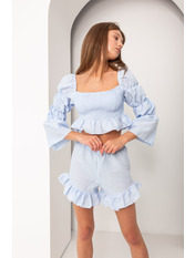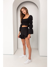 Трендовий топ укороченого крою з квадратним вирізом. Ефектний довгий рукав з воланом та декор рюшами – одні з найактуальніших деталей.