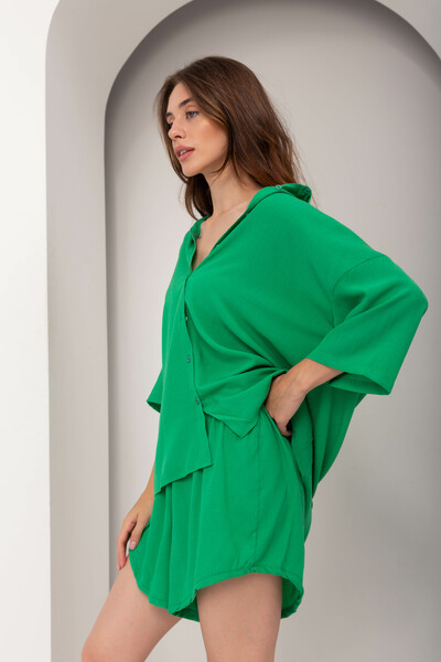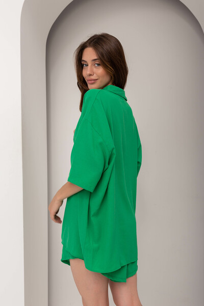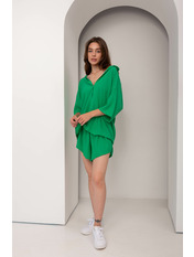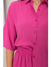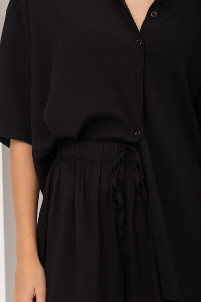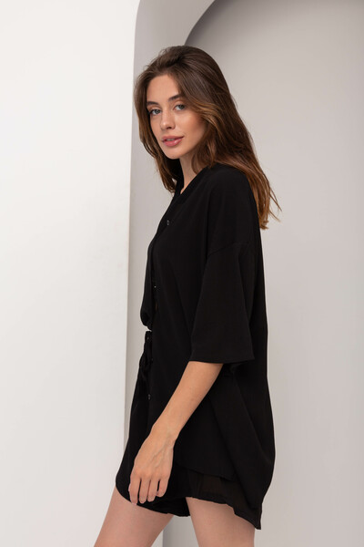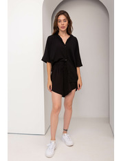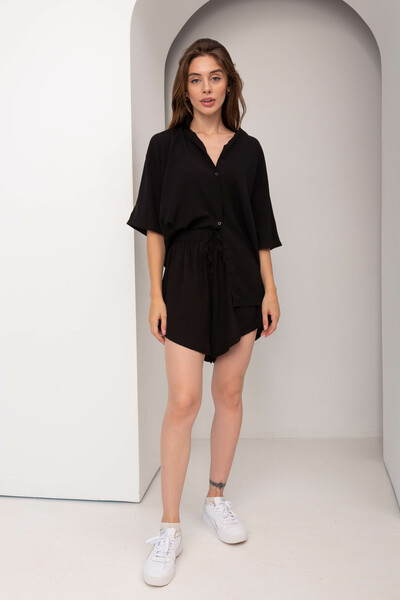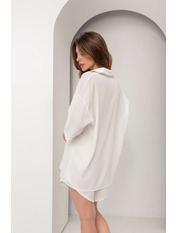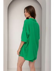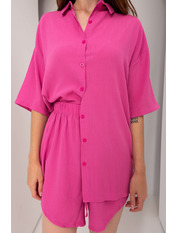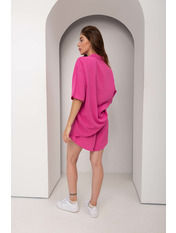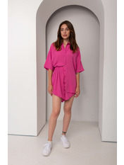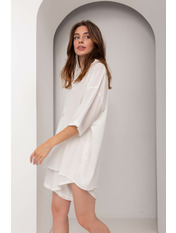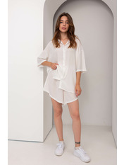 Верх костюму- сорочка вільного крою. Низ – шорти на резинці. У ньому можна вийти на прогулянку в середині дня, на роботу або використовувати як чудовий варіант на кожен день. Речі можна комбінувати окремо. Наприклад сорочка відмінно поєднується зі штанами, спідницями, джинсами, роблячи найпростіші комплекти неймовірно стильними.