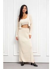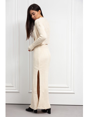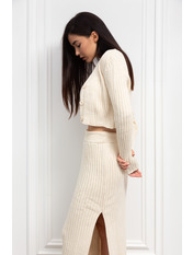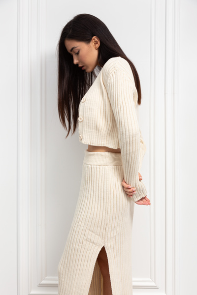 Цей трикотажний костюм KT-4038 в кремово-білому кольорі — чудовий вибір для тих, хто цінує комфорт та стиль у повсякденному гардеробі. Комплект складається з топа, кардигана на ґудзиках та спідниці-міді, що робить образ жіночним і витонченим. Рельєфна текстура трикотажу додає комплекту особливого шарму, підкреслюючи лінії фігури. Ніжний кремовий відтінок надає легкості, елегантності й прекрасно підходить для будь-якого сезону, поєднуючись з іншими елементами гардероба.