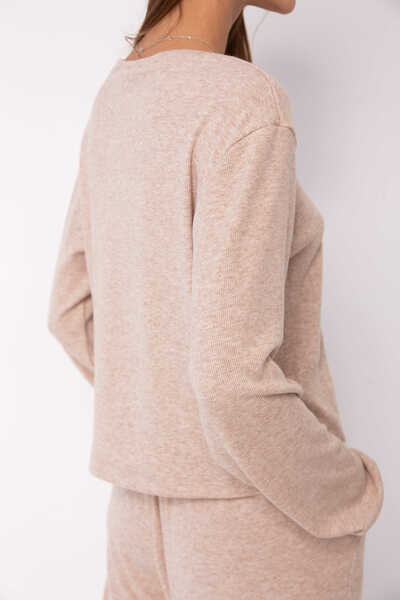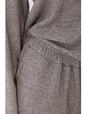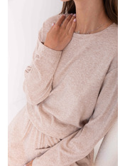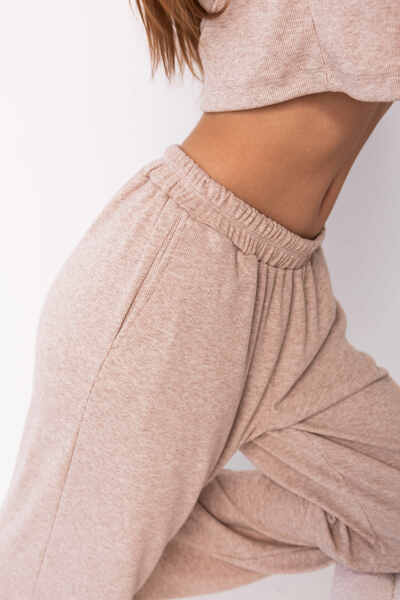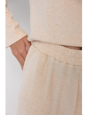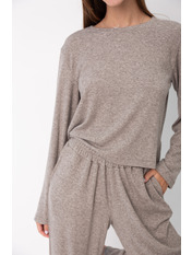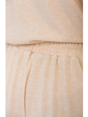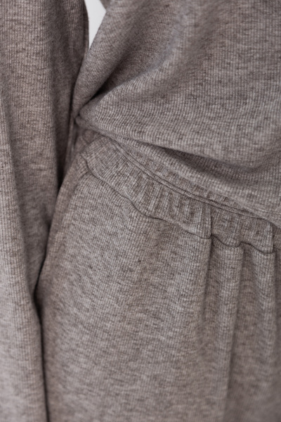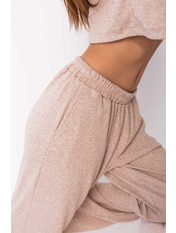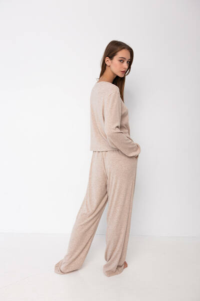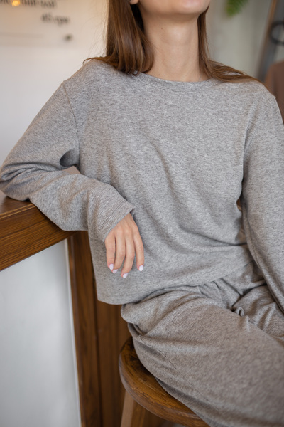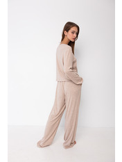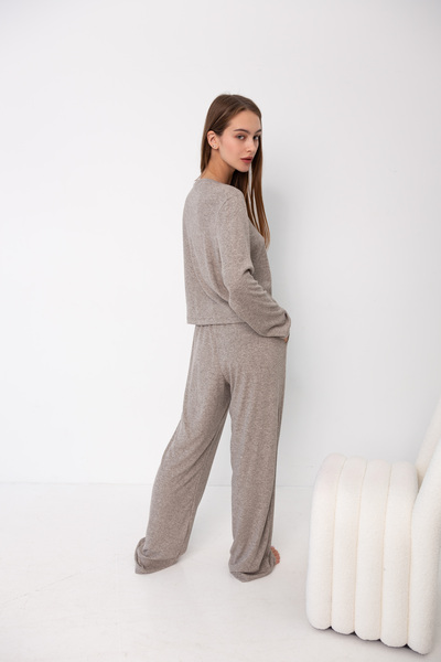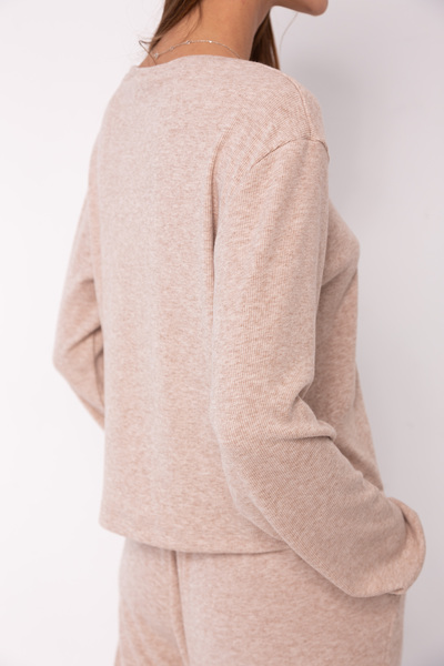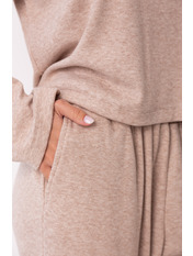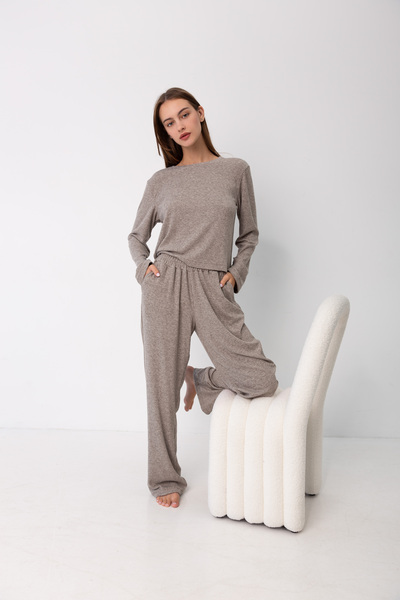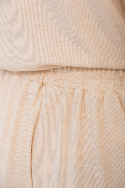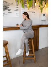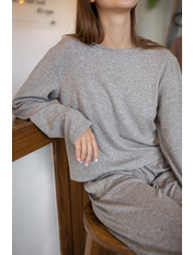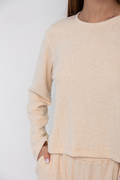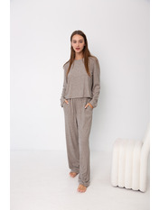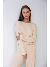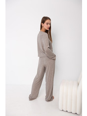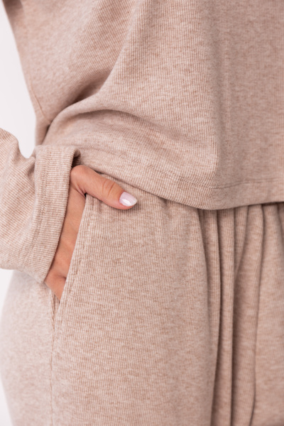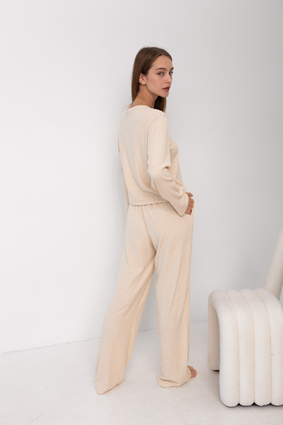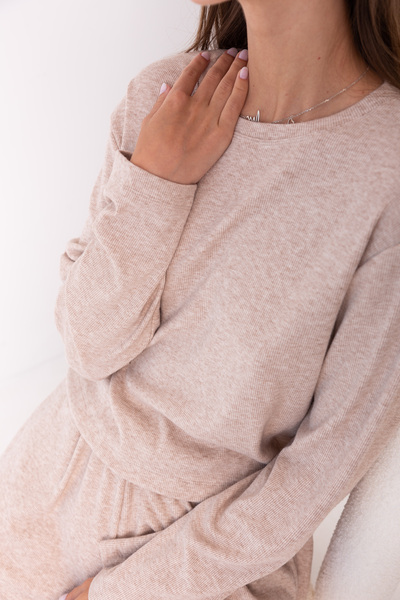 Ця модель костюма представлена у розмірі M-L. Верх представлений кофтою, низ – штанами. Кофта з довгими рукавами вільного крою. Штани теж просторі, на резинці, трохи подовжені. Трикотаж в рубчик світлих відтінків прикрасить вас, підкресливши красу та елегантність.Як доглядати та носити