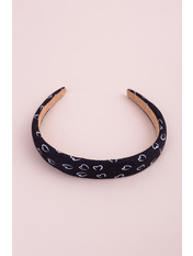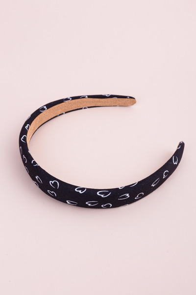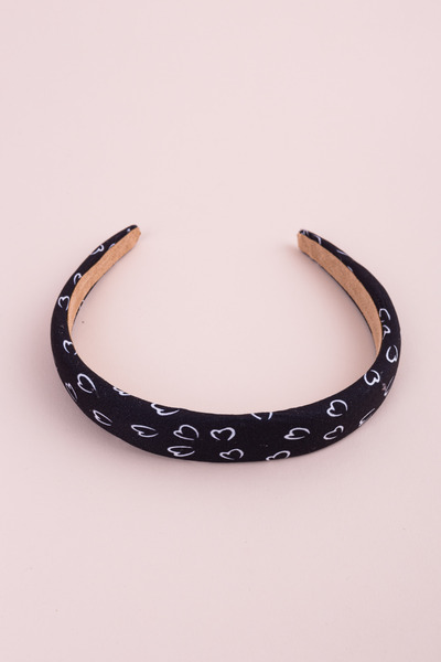 Обруч представлений у чорному класичному кольорі. Світлі мінімалістичні сердечка виглядають контрастно на темному тлі.Як носити обруч