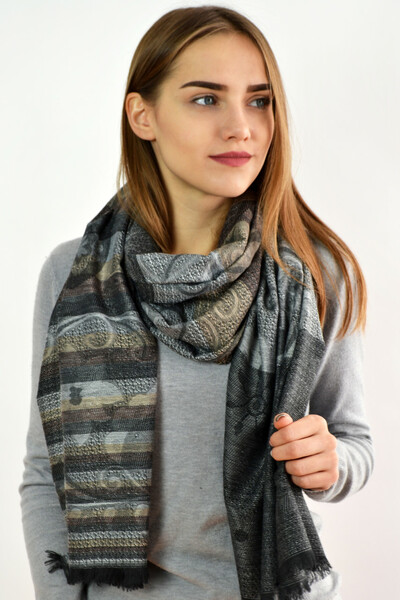 • Теплий шарф з віскози для холодної пори року. Щільний дихаючий матеріал, насичений графітовий колір з переходами і квітковими візерунками. Нерівні кромки. Об'ємний, його можна накинути на голову або обмотати навколо шиї.