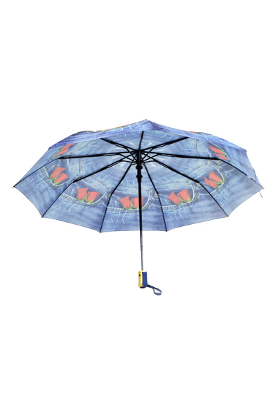 Складана жіноча парасолька напівавтомат. Джинсовий дизайн з квітковим принтом. Купол з водонепроникної тканини, корпус і 9 спиць зі сталі, зручна пряма ручка. Чохол у комплекті. Система "антивітер" для комфортних прогулянок. Замовляй!