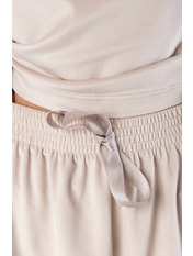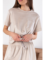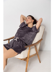 Ця модель піжами складається з футболки та шортів. Зручна футболка має одну невелику кишеню спереду. Шорти тримаються на резинці та закріплюються за допомогою стрічки.