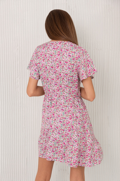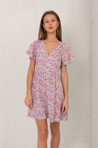 Грайлива сукня з квітковим принтом представлена у ніжних відтінках. Довжина виробу – міні (зауважте, що зріст моделі на фото 170 см.). Простий вільний крій виробу ідеально підходить для спекотної погоди. Застібається сукня за допомогою гудзиків спереду.