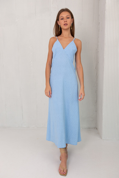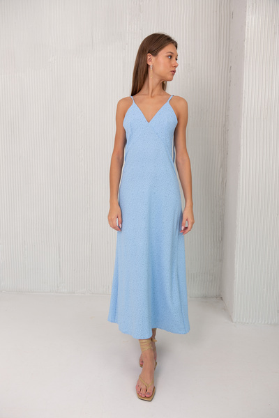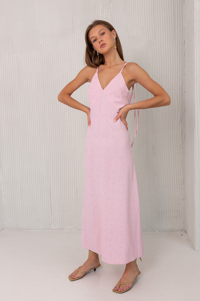 Сукня довжини міді та прямого силуету. Замість рукавів вона має тонкі бретелі, які зав'язують та таким чином регулюються. Ця модель має V-подібний виріз, який можна доповнити улюбленою підвіскою. Також у цієї сукні досить відкрита спина, яка виглядає ефектно та зробить ваш образ ще більш грайливим та жіночним.Як доглядати
