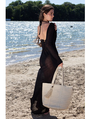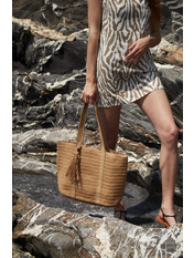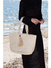 Дана модель є вмісткою та об'ємною, і зможе помістити всі пляжні речі, крім того стане в нагоді на шопінгу і не залишить ваш образ без уваги на звичайній прогулянці. Модель виконана з соломи всередині з текстильною підкладкою на застібці та вшитим боковим внутрішнім карманом. Ручки подовжені, на ручці підвісний аксесуар, що знімається.