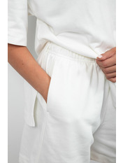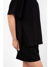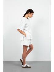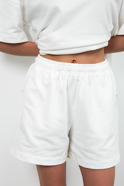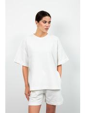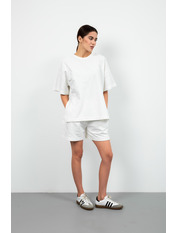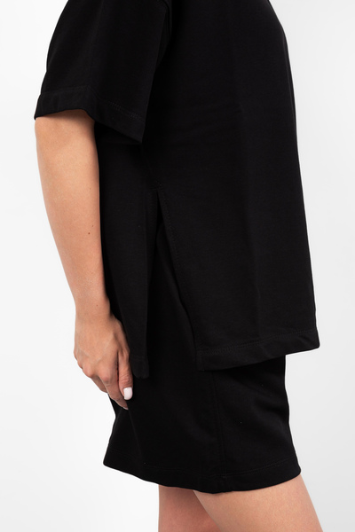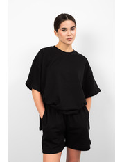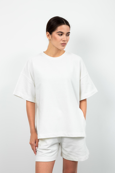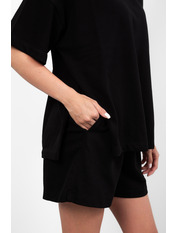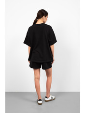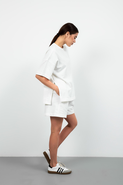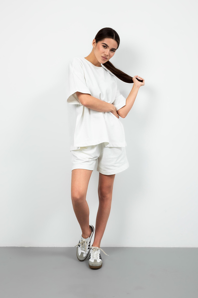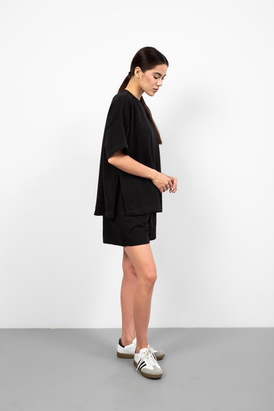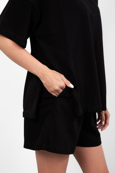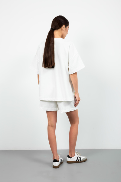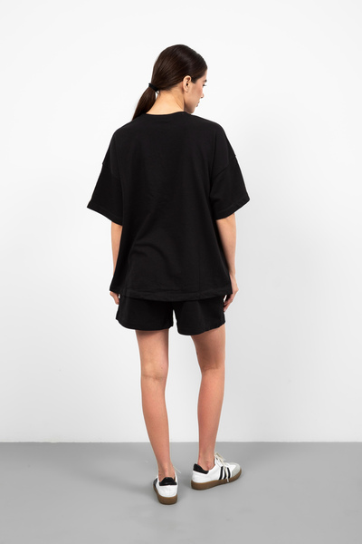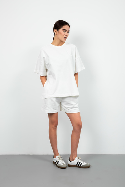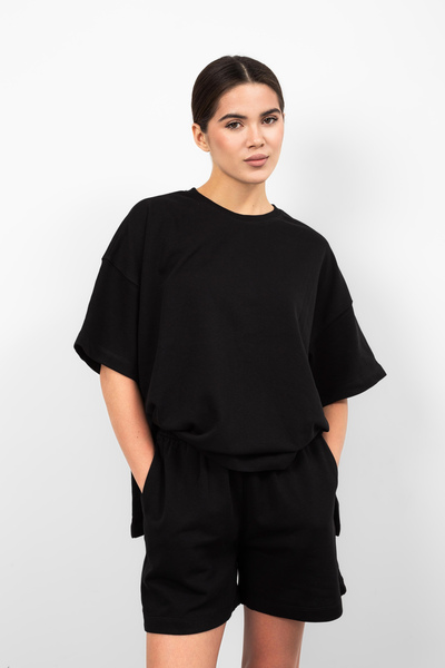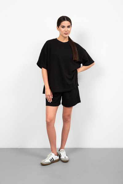 Футболка вільного крою забезпечує максимальну свободу рухів та вентиляцію в спекотну погоду. Її класичний дизайн дозволяє носити її як окремо, так і в поєднанні з іншими шортами чи джинсами. Шорти мають еластичний пояс та зручну посадку, що гарантує комфорт протягом всього дня. Оптимальна довжина шортів надає образу легкості та сучасності.