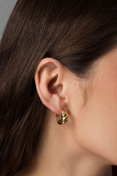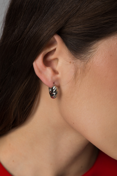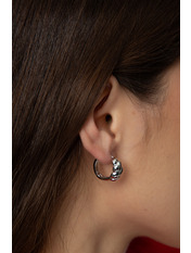 - Реліфна конструкція кілець додає об'ємності, а надійна застібка фіксує прикрасу, запобігаючи випадінню.