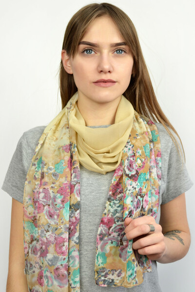 Легкий шарф з весняної колекції. Ніжні пастельні кольори з рослинним візерунком. Легкий напівпрозорий матеріал, оптимальний розмір. Шарф можна накинути на голову або обмотати навколо шиї. Як носити вирішувати тобі!