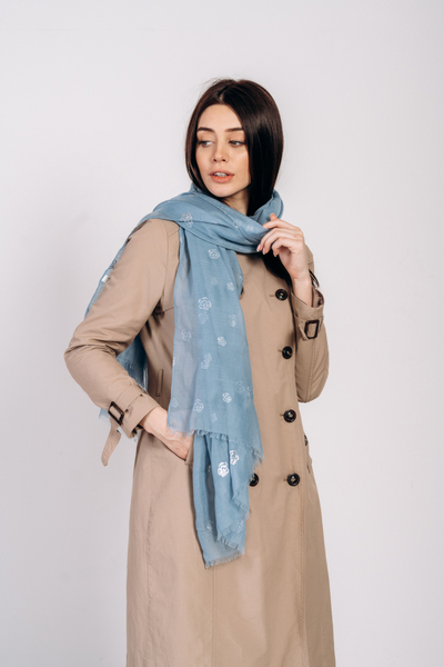 • Весняний легкий шарф. Однотонний дизайн з контрастними срібними трояндами і необробленими краями. Ідеально на прохолодну і вітряну погоду. Можна намотати на шию або накинути на голову. Як тобі більше подобається.
