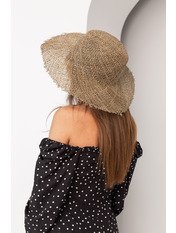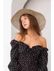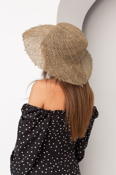 Розмір даної моделі капелюха - one size. Такий розмір є універсальним і підходить для будь-якого обхвату голови.Солома переплетена нещільно, тому капелюх ще краще пропускає повітря. Верх капелюха округлий, поля прямі та широкі. Родзинкою моделі є необроблені краї полів. Така деталь додасть образу безтурботності та романтичності.