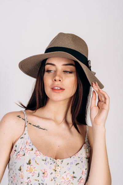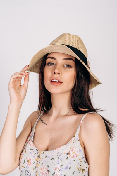 • Класичний капелюх федора. Однотонні пастельні кольори, тулія з трьома вм'ятинами, прямі поля середнього розміру, контрастна стрічка. Матеріал не боїться солоної води або жаркого сонця. Підійде до будь-якого твого outfit. Як тобі?
