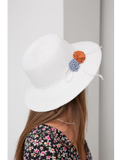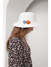 Дана модель представлена у розмірі 56.Слауч – тип капелюха з опущеними хвилястими полями середньої ширини. Верх виробу округлий, а жорстку тулію прикрашає тоненька мотузка, яка закінчується бантиком. Родзинкою цієї моделі є невелика квіткова композиція, яка прикрашає бант.