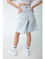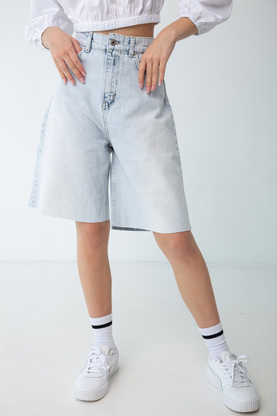 Стильні джинсові шорти для повсякденного носіння. Кишені з боків і ззаду додадуть комфорту і зручності при носінні даної моделі шорт. Висока посадка прекрасно підкреслить вашу талію. Застібка виконана у вигляді блискавки і гудзики. Модель-бермуди.