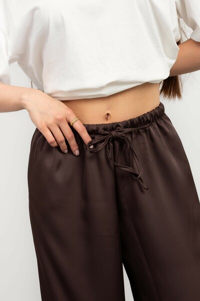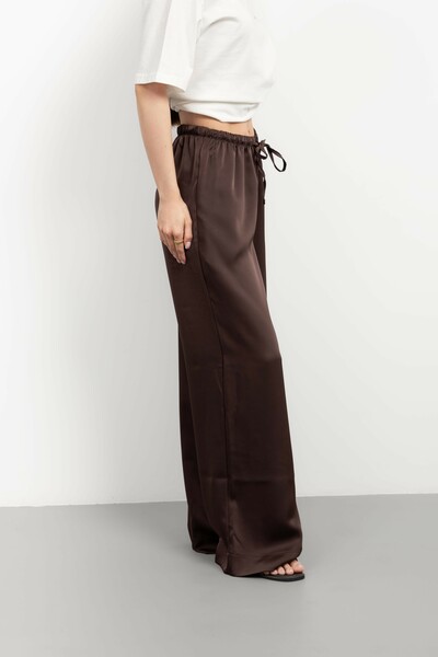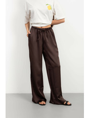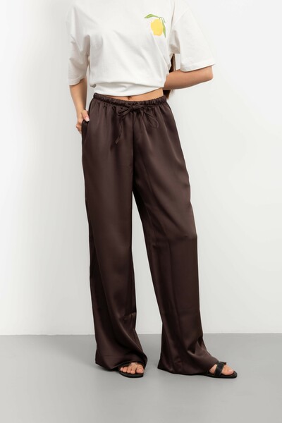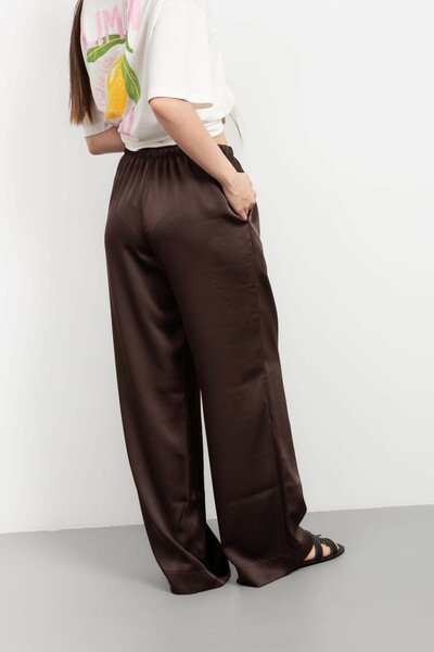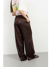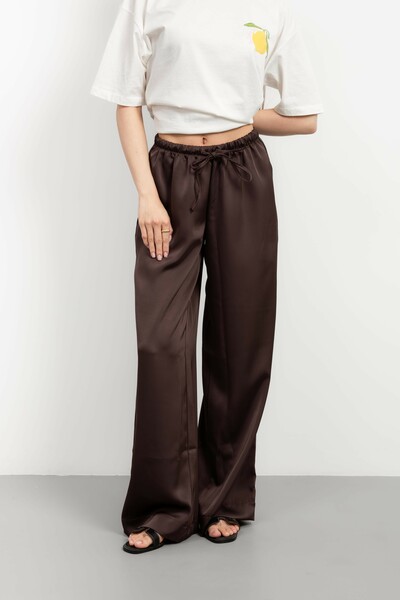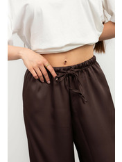 Ці штани – втілення елегантності та комфорту, створені для жінки, яка цінує вишуканість у кожній деталі. Виготовлені з високоякісного сатину, вони дарують неймовірне відчуття легкості та м'якості на шкірі, а їхній насичений шоколадний колір додає образу глибини та розкоші.