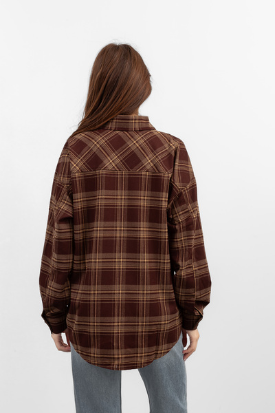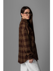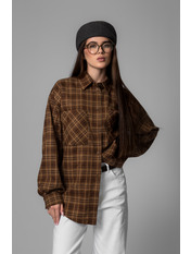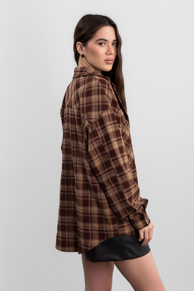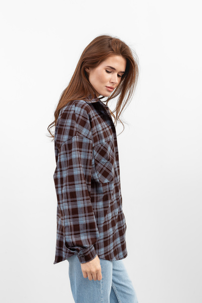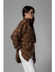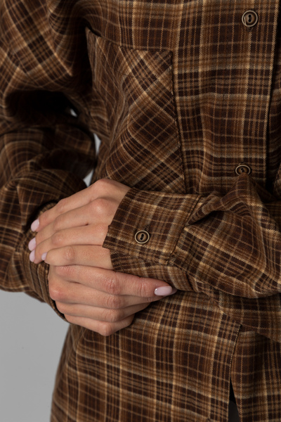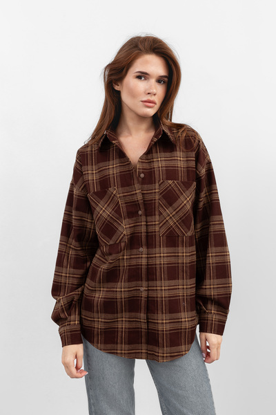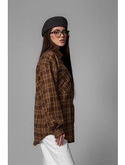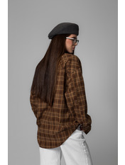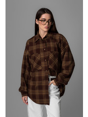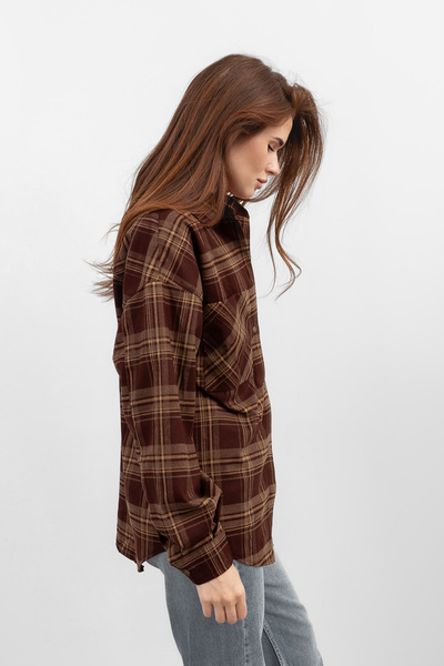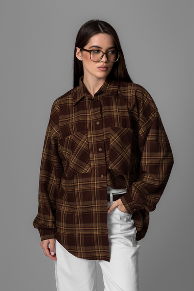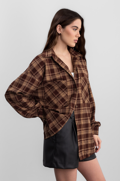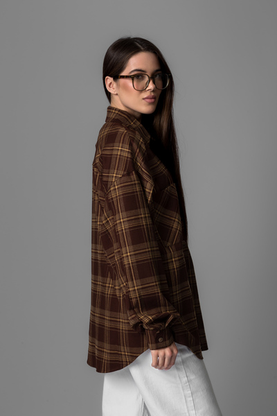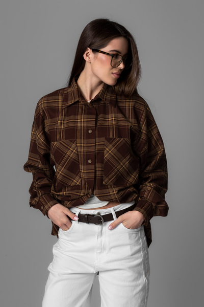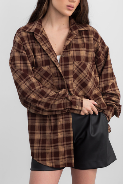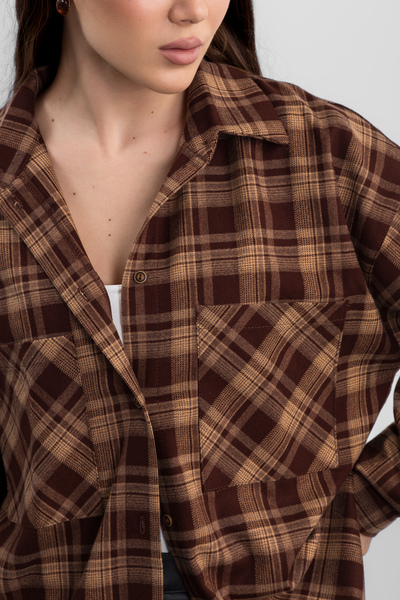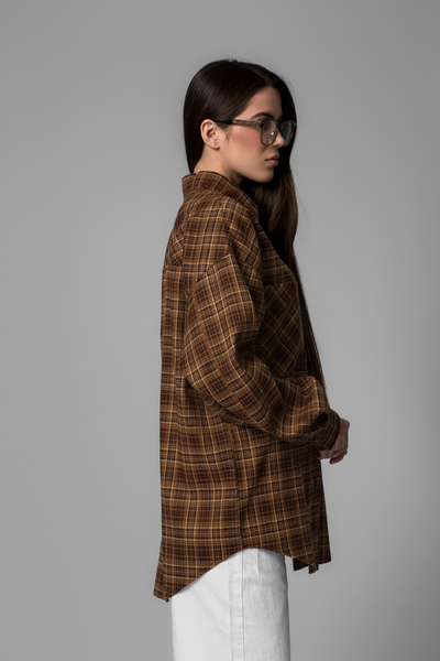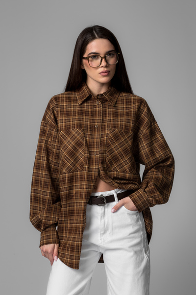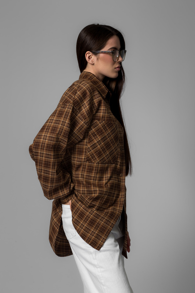 - Класична клітинка в коричневих та бежевих тонах робить цю сорочку універсальною для різноманітних образів.