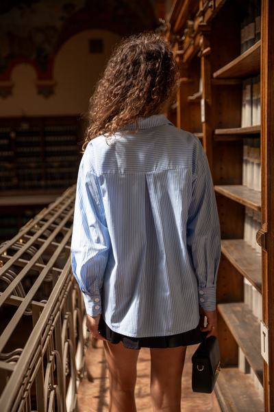 - Класичний дизайн у біло-блакитну смужку легко комбінується з різними стилями одягу - від офіційного до повсякденного.