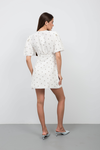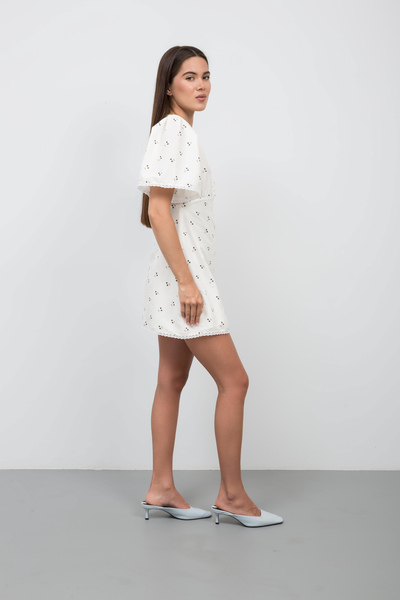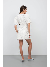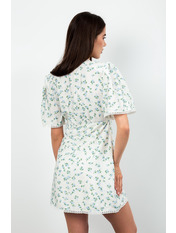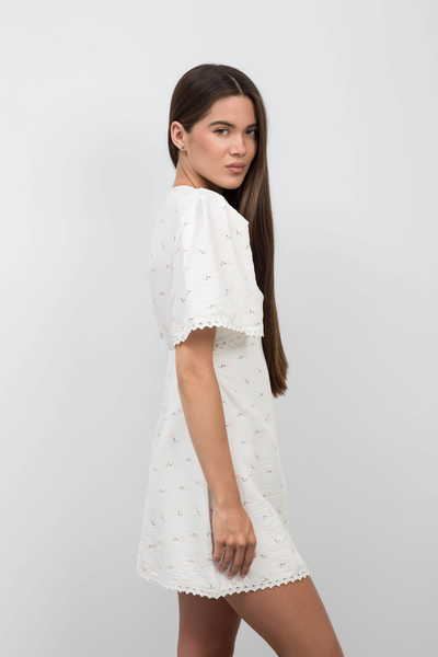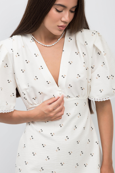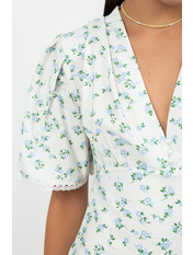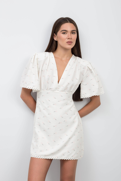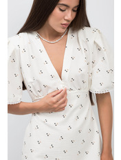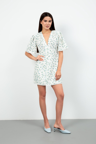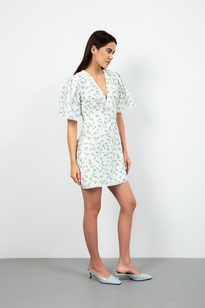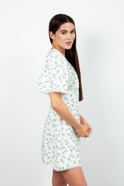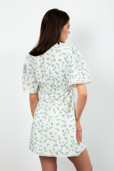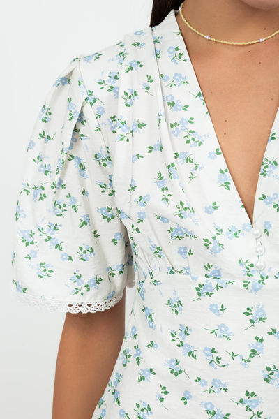 - Візерунок з блакитними квітами на молочному тлі створює ніжний та свіжий образ, який привертає погляди.