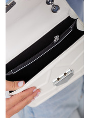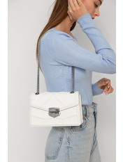 Сумка прямокутної форми у невеликому розмірі. У три відділення легко помістяться всі необхідні речі. Плечовий ремінь представлений металевим ланцюжком сріблястого кольору. Застібається ця сумка за допомогою блискавки та клапана.