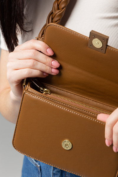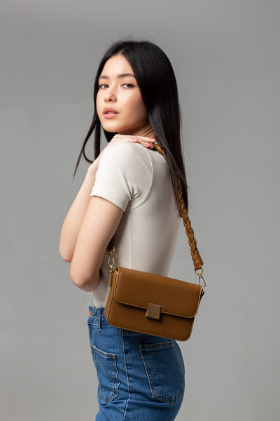• КоричневийСумка виконана з еко-шкіри. Екологічна шкіра є аналогом натуральної, але виробляється зі штучних матеріалів без участі тварин. Цей матеріал міцний, стійкий до зношування та легко очищується.