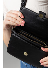 Сумка прямокутної форми представлена у меншому розмірі. Модель має 4 відділення, в які легко помістити необхідні у повсякденні речі. Сумка має два змінних ремні: звичайний регулюємий та плетений. Вся фурнітура (застібки, карабіни та кнопки) виконана у золотому кольорі, який додає виробу блиску та розкоші. Застібається сумка за допомогою блискавки та однієї кнопки.Як доглядати