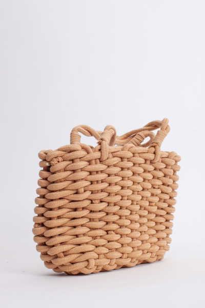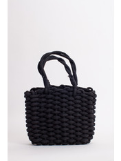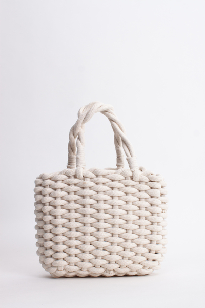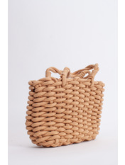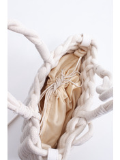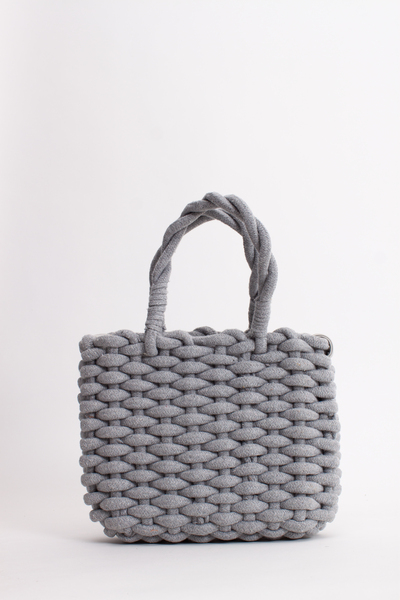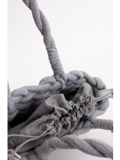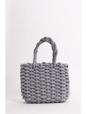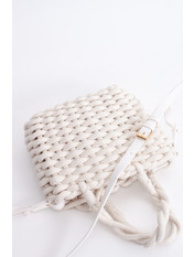 Оригінальна модель сумки в середньому розмірі. Основа сумки виконана з плетення щільних мотузочок трикотажної пряжі, коротші дві ручки також в цьому стилі, є подовжений ремінець який можна знімати або ж просто ховати, він виконаний з якісного замінника, довжина регулюється. Сумка має підкладку, вона в вигляді прямокутного тканевого мішечка на затяжці. В даній моделі є допустимим погрішності в плетінні, не оброблені кінці.