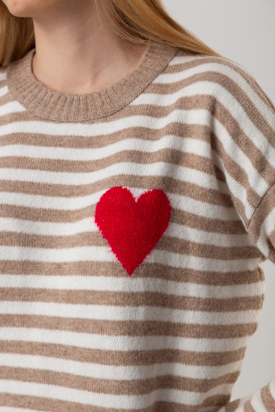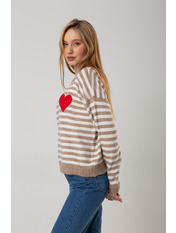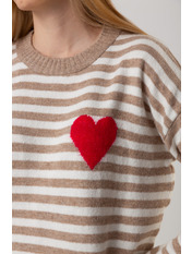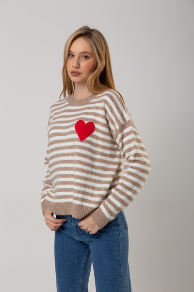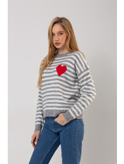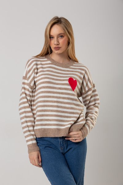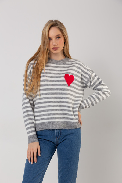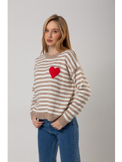 Ця модель представлена в універсальному розмірі one size.Светр прямого крою, з круглим невеликим вирізом. Дизайн светра – смужка з принтом сердечка зліва.