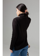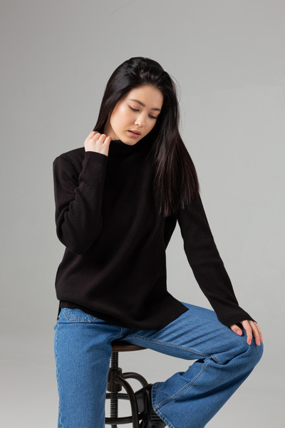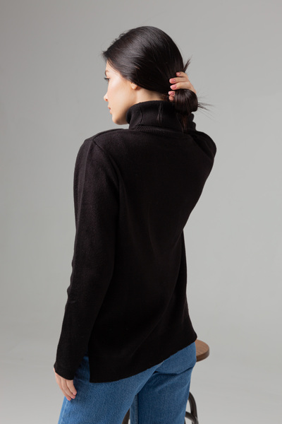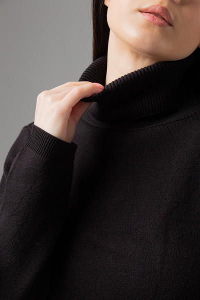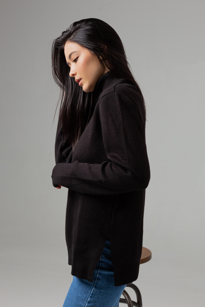 Светр прямого крою має затишний комір, який захистить вас від холоду та вітру. З обох боків є невеликі декоративні розрізи.