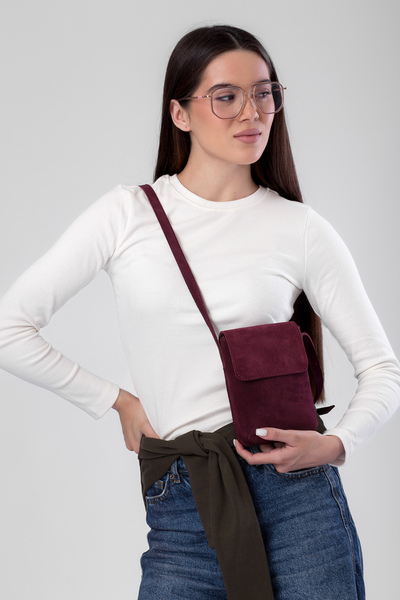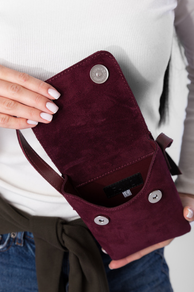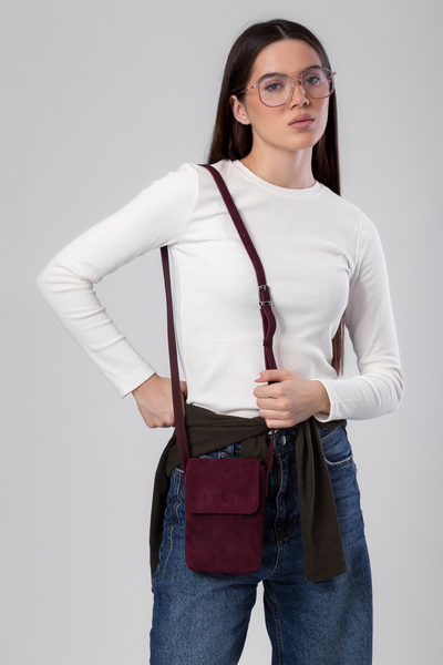 • Сумка жіноча з натуральної замші SYM-50022-1 у бордовому кольорі — елегантний аксесуар, що додасть вишуканості вашому образу.