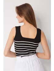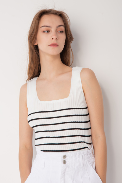 Розмір топа – one size. Цей розмір є універсальним. Підійде для людей, які носять розміри S,L і M. Довжина топа – 47 см, обхват грудей – 66 см. Особливий елемент даної моделі – горизонтальні смуги, які контрастують з кольором топа. Бретельки у топа широкі та комфортні, не регулюються. Виріз квадратної форми.