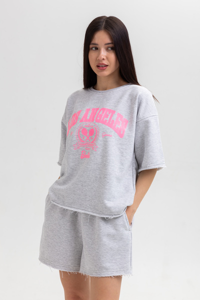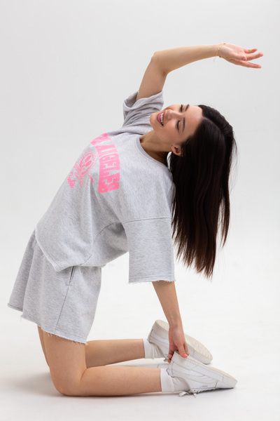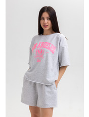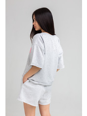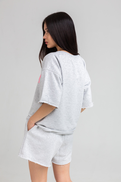 Трикотажний костюм доступний у розмірах XS/S та M/L. Усі характеристики розмірів можна переглянути у спеціально створеній таблиці.Костюм складається з футболки та шортів. Футболка вільного крою має стандартний круглий виріз. Рожевий принт гармонійно поєднується з сірим кольором футболки і виглядає дуже стильно. Зручні шорти на резинці мають кишені з обох боків.