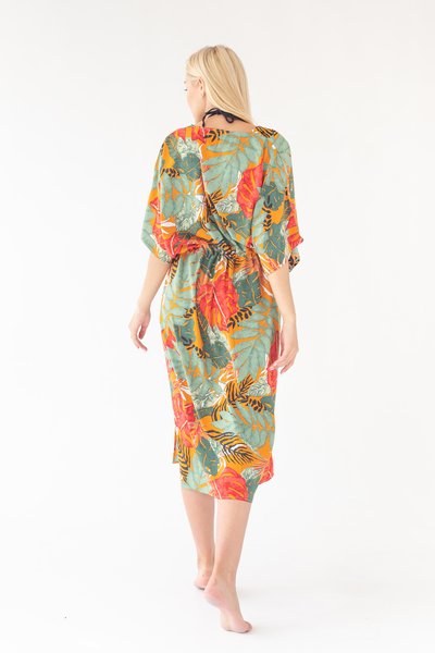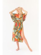 Жіноча туніка з рослинним принтом. Яскравий дизайн, вільний фасон, бокові розрізи, рукава 3/4, довжина нижче коліна. Спереду затягується мотузком. Чудовий аксесуар не тільки для пляжного образу, але і як елемент повсякденного стилю. У нас можна купити парео на будь-який смак!