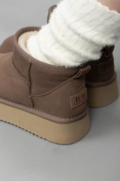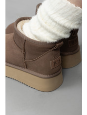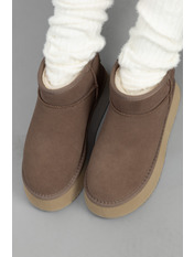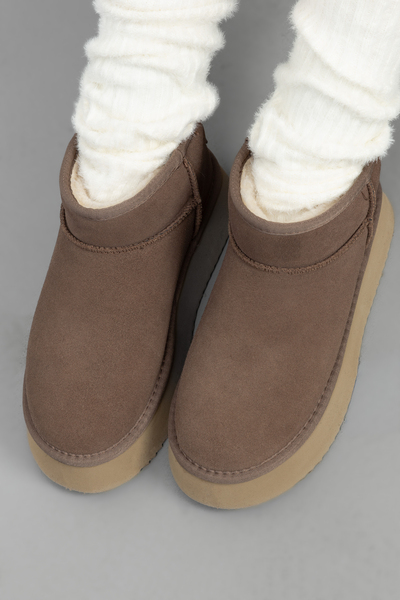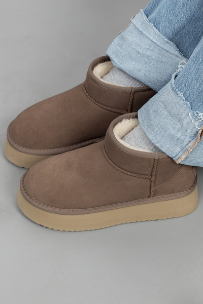 • Замшеві стильні уггі коричневого кольору. Вони мають характерну форму з округлим носком та піднятою п'ятою. Уггі виготовлені з натуральної замші, що забезпечує тепло та комфорт. Підошва у цих уггах товста та плоска, що надає їм сучасного вигляду. Уггі мають м'яку внутрішню підкладку, яка забезпечує додаткове тепло та комфорт. Вони ідеально підходять для холодних зим та осінніх днів. Уггі можна носити з різним одягом, від джинсів до суконь, створюючи різноманітні стильні образи.