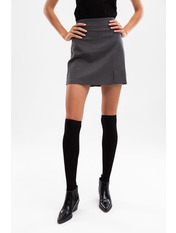Сіра спідниця міні добре поєднується з яскравим верхом, в ролі якого можуть виступати в залежності від сезону щільні штани і легкі топи, блузи та футболки.